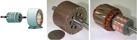Rotor (levo) i stator (desno) asinhronog motora sa kaveznim rotorom (bez namotaja na rotoru); Kavezni rotor asinhronog motora; Namotani rotor asinhronog motora