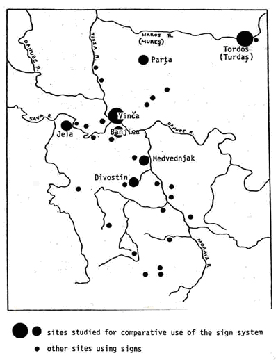 Visokom ili ga koristila. On je svoju studiju fokusirao na sistem simbola iz srednjeg Neolitskog doba na Vinčansku i Tordos kulturu a naselja ove kulture je predstavio na mapi ispod.
