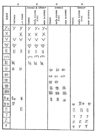 Obja�njenja ovih simbola su različita, ali se zaključilo da su ovi znakovi kori�ćeni u različite svrhe. Veruje se da su kori�ćeni u ritualima i magiji, brojčanom sistemu koji je pokazivao količinu hrane koja je u posudama, kao i indentifikaciju pojedinca ili familije kojoj ta hrana pripada. Postoje indicije i da su neki od znakova dekorativni motivi i prikazi prirodnih fenomena, sunca, meseca, zvezda, �ivotinja, reka, bogova� Megalitni kamen K-1 koji je pronađen u tunelu u Visokom mora imati religijsku pozadinu te se tako trebaju i tumačiti znakovi na njemu. U svojoj knjizi sam obradio va�nost pećina, tunela i kamena za religiju paleolitskih naroda a povezivanje dubokih pećina i tunela sa bogovima je ve�an za sve rane religije od Engleske i Egipta do Centralne Amerike. Slični znakovi koji su pronađeni na Balkanu su pronađeni i u Mesopotamiji i Kini, a te znakove na dalekom istoku njihovi naučnici smatraju pretečom pisma. U studiji Shan M. M Winn-a on predstavlja nekoliko znakova koji bi mogli da predstavljaju znakove za �enu i mu�karca, a ovi znakovi su česti na predmetima pronađenim u Vinči i Lepenskom Viru kao i na skici K-1. Ovaj znak koji izgleda kao strelica predstavlja �enski znak�