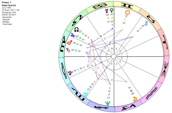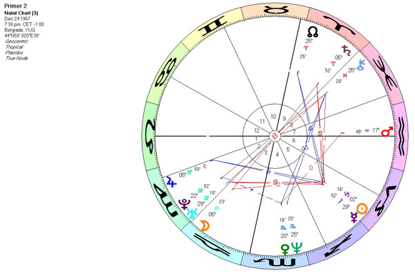 Primer 2: I ova �enska osoba je Sne�ana, ali sa daleko problematičnijom pričom, jer za razliku od Paule Ascendentalne Device, ova Lavica na Ascendentu sa Suncem u Jarcu u kvadratu sa Saturnom nije spremna na kompromise i promene, upravo jer je njeno ime u simbolici Saturna koji je ovde u lo�em dostojanstvu i aflikuje vladara Asc, kao i Mesec, �to je jo� va�nije, jer je i Mesec ključni igrač kao planeta koja simboli�e ovo ime. Ovaj T-kvadrat upućuje na nemogućnost ostvarenja bliskosti, na vrlo autoritativnu osobu, na izvestan problem u odnosima jer je Mesec u Vagi, a Saturn vladar 7. Sigurno je da bi priča bila slična ma koje ime da nosi ova osoba, ali bi simbolika Jupitera koji podr�ava Sunce doprinela da se vi�e raduje, da ima vi�e vere, duha, poverenja, pa bi razvod bio manje dramatičan i te�ak, biv�i suprug manje grub i preteći, deca (Jupiter vladar 5) radosnija i u podjednako dobrom odnosu i sa njom i ocem (trigon Sunce). Jovana, Sofija, Aleksandra bi daleko lak�e metabolisale ovu energiju... Za razliku od Mesečevih, Merkurova imena su neutralnija, prilagodljivija i upućuju na dinamičan, zanimljiv �ivot, a u skladu sa prirodom samog Merkura u horoskopu. Treba ih izbegavati ukoliko je Merkur aflikovan od Saturna, jer mo�e uputiti na hendikep, probleme sa inteligencijom, kretanjem, u komunikaciji, a izabrati ukoliko je ova planeta podr�ana beneficima, gde će upravo naglasiti suprotno pomenutom. Venerina imena upućuju na hedoniste, one �eljne ljubavi, sklone umetnosti, ali i materijalizaciji, kao i one kojima su odnosi uslov za ispunjenje. Aflikovana Venera uputiče na probleme u svemu navedenom. Marsova imena zahtevaju sna�nu ličnost, sna�nu energiju iz 1. kuće, jer u suprotnom osoba neće moći da prati svoje ime i stoga će preterivati u grubosti i dokazivanju i nekanalisanom tro�enju energije. Jupiterova imena su generalno povoljna, ali mogu uputiti na preterivanje ako je aflikovan, u oblasti planeta koje Jupiter aspektuje, kao i znaka i kuće u kojima se nalazi. Neretko mo�e ukazati na problem sa verom, novcem, moralom, a povoljan na veoma pozitivnu, dare�ljivu osobu �eljnu avantura, znanja, potpuno otvorenu. Saturnova imena su najzahtevnija i preporučuju se samo ako je Saturn sna�an, jer je Saturnov uticaj daleko sudbinskiji od svih ostalih planeta, pa aflikovan mo�e privući najte�u sudbinu koju polje energije u trenutku rođenja nudi. Imena u simbolici transcendentnih planeta zahtevaju posebnu prirodu, kao �to su posebne i ove daleke planete koje te�ko dosti�emo, a čija je priroda na prosečnom nivou svesti primarno malefična. Ukoliko horoskop nije sna�an u celosti, a ta planeta posebno povoljno postavljena, te�ko da je natus mo�e �iveti, a to znači da nije ni povezan sa energijom svog imena. Ime je energija koja nas prati sve vreme, koja nam daje ili oduzima, a pravilan izbor podrazumeva da �ivimo najbolje od te planete i da smo radosni svaki put kada nas neko prozove i kada osetimo vibraciju svog imena...