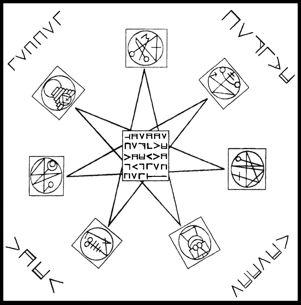 41. Kada priziva� Moći Starih Bogova Njihove Pečate izre�i na pločama od Njihovih metala, ili ih iscrtaj na čistom pergamentu u Njihovim bojama, kako sam već opisao u Knjizi ulaza. I ovo znaj, Skriveni Sve�tenici imaju Veliki Pečat Prizivanja Sedam Bogova iscrtan na pergamentu cele ko�e crnog jarca �rtvovanog u Slavu Drevnih. I video sam taj isti Pečat urezan na kamenom Oltaru Prizivanja, ili je to na kamenoj ploči koja staja�e na Oltaru, ne znam. Veliki Pečat Prizivanja Sedam Bogova Sedam Sedam Nebesa u Obredu Silaska u Bezdan je ovaj �to sledi.
