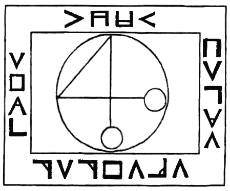 47. Veliki Pečat Prizivanja na Oltaru treba da bude icrtan na pergamentu od ko�e �rtvovanog crnog jarca u Slavu Drevnih i krvlju njegovom. Mada je bolje ako je na oltaru u kamen urezan Pečat i ispunjen �rtvovanom krvlju. Znamen Prizivanja Jugota je ovaj �to sledi.