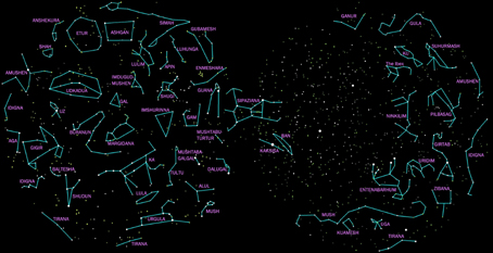 Na slici desno: Prikaz sumerske predstave o nebesima sa izvornim nazivima zvezda i sazve�đa (klikni na sliku za uvećan prikaz) Od prvih proučavanja neba koja su vr�ili Sumerci i Asirci, pre oko 6.000 godina, proteklo je mnogo vremena do postavljanja teorije celine koju su oko 2500. pre n.e. formulisali sumerski magovi. Oni su verovali da se jednog dana Tijamat rodila iz prvobitnog okeana koji je prekrivao kako Nebo, tako i Zemlju. Tvorac Bel ga je udarcem mača isekao na dva dela i od svake polovine napravio po jedan svod, jedan ispod drugog, nebeski i zemaljski. I jedan i drugi su bili nepokretni. Na nebeskom svodu su se nalazila sva tela, zvezde, koje su Bogovi vodili po tačno označenom putu pod svemoćnim Belovim nadzorom. Druga tela, planete, koje se nisu kretale tačnom putanjom koju je odredio Bel, bile su podređene Anuu, sveop�tem ocu. Prva Nebesa - Bog Nana (Sin) - planeta Sin - Mesec Druga Nebesa - Bog Nebo - planeta Mustabaru - Merkur Treća Nebesa - Boginja Inana (I�tar) - planeta Kilbat - Venera Četvrta Nebesa - Bog �ama� (Udu) - planeta Udu - Sunce Peta Nebesa - Bog Nergal - planeta Bibou - Mars �esta Nebesa - Bog Marduk - planeta Dapinou - Jupiter Sedma Nebesa - Bog Ninib - planeta Kajmau - Saturn Ova teorija nebeskog ustrojstva koja je u korenu celokupne astrologije pre svega je mitolo�ka. Grčki istoričar Diodor koji je proučavao sumersku civilizaciju ka�e: Sedam zvezda podređenih Anuu otkriva buduće događaje i tumači ljudima blagonaklone namere Bogova. Prividno kretanje Sunca kroz ekliptiku pokazalo je sumerskim magovima da se ono svakog meseca kreće kroz drugo sazve�đe. Ovo posmatranje je u osnovi Zodijaka podeljenog na dvanaest delova od kojih svaki nosi ime pređenog sazve�đa. Grci koji su sistematizovali sva znanja astrologije su sazve�đima dali druga imena, koja odgovaraju njihovoj mitologiji, ali su mesopotamijski astrolo�ki znaci bez sumnje dosta slični ovim nama poznatim. 1. Kuzarikut (Ovan) je prvi znak Zodijaka koji je prelazna faza jer zvezde iz sazve�đa Ribe i Kit figuriraju u ovom delu Zodijaka. U pravom smislu reči, to je znak poljoprivrede. 2. Te-Te (Bik) predstavlja drugi znak, a prikazan je kao �ivotinja slična biku upregnuta u kočije koje je Boginja I�tar upotrebila da bi pobedila Gilgame�a. 3. Tua-mu ili Mas-Masu (Blizanci) odgovaraju dvojici bo�anske braće Nebou i Marduku koje su Grci nazvali Kastor i Poluks. Dvostruka priroda ovog znaka proizilazi iz borbe između dva brata neprijatelja. 4. Nangaru ili Al-Lul (Rak) je znak koji obiluje simbolizmom, a znači �tipaljka krabe i podseća na Mlad Mesec koji je i vladar ovog znaka. 5. A-ru (Lav) je bio poistovećen sa zvezdom Regulus koja se pojavljuje kada je Sunce jako kao i lav, kralj �ivotinja. 6. �i-ru ili Ki (Devica) čije haldejsko ime znači uvo �ivota je simbol majke u pravom smislu. Ovaj znak predstavlja kult braka. 7. Zibanitu ili Nuru (Vaga) označava ravnote�u između dana i noći kao i između �ivota i smrti. 8. Akrabu (�korpija) predstavlja čoveka zmiju koji je pomogao Tijamat da se odupre napadima Bela stvoritelja. 9. Pabilsag (Strelac) je nastavak predhodnog znaka jer strela koju dr�i je �aoka �korpije. 10. Saku ili Enzu (Jarac) je dosta postojan znak koji je imao tumačenje isto kao i danas. 11. Gu ili Mulugula (Vodolija) znači veliki čovek i predstavlja sazve�đe Gilgame� koje su Grci nazvali Herkules. 12. Nunu ili Zib (Ribe), dvanaesti i poslednji znak Zodijaka, zatvarao je lunarnu godinu, sa umiranjem prirode pre prolećnog uskrsnuća. Nebeska Kraljevstva, koja se spominju u vi�e navrata kroz tekst Nekronomikona, su zapravo Znaci Zodijaka i imaju astrolo�ki karakter. Tako npr. kada se ka�e da Bog Nergal ulazi u Kraljevstvo A-ru, to znači da se planeta Bibou (Mars) kojom vlada Nergal kreće kroz Nebesko kraljevstvo A-ru (Lav), znači, savremenim astrolo�kim jezikom rečeno, Mars u Lavu. Potrebno je jo� pomenuti astrolo�ke odnose (planetarne aspekte) i polja ili kuće u horoskopu. Kada se ka�e: kad �ama� uđe u Kraljevstvo Te Te, a I�tar i Nebo su u zagrljaju u drugom Kraljevstvu udaljeni, to znači da Sunce prolazi znakom Bika, a Venera i Merkur su u konjukciji u Blizancima, itd. Polja ili kuće u horoskopu (dnevni i noćni sati), označavaju se kao Nebeske Palate u Kraljevstvima Svetla i Tame. Primer: kada Marduk uđe u drugu Palatu Kraljevstva Svetla, a Ninib je u Kraljevstvu Akrabu, znači: Jupiter treba da bude u drugom satu, tj. kući horoskopa dok se Saturn nalazi u sazve�đu �korpije, itd. Celokupna filosofija i knji�evnost posvećena simbolima i tumačenju matematičke astronomije u Sumeru je svoj vrhunac dosegla oko 2500. godine pne. Sakupljena je i sređena tek negde oko 1000. godine pne. u delu poznatom kao Enuma Anu Enlil. Ova astrologija vi�e je mundalna i astrometeorolo�ka jer se bavi uglavnom narodom u celini, a pojedinačno samo kraljevima i plemićima. Sudbinom drugih pojedinaca se nije bavila. Prvi razlog proučavanja neba bio je kalendarskog tipa, a u svrhu predviđanja vremenskih prilika kako bi se mogao planirati razvoj poljoprivrede. Enuma Anu Enlil jasno sugeri�e da postoji veza između onog �to se de�ava na nebu i onog �to se de�ava na zemlji. Od V veka pre n.e. sumerski magovi stvaraju liste povoljnih i nepovoljnih dana i meseci sa znamenjima i putanjama Sunca, Meseca i planeta kroz Zodijak, a koji se odnose i na pojedince. Naravno ovde treba jasno podvući razliku između tumačenja pozicija na nebu kao indikatora za proricanje zemaljskih događaja i tumačenja i interpretacije zabele�enih pozicija koje znamo kao horoskopsku ili genetlialogijsku astrologiju. Kad se tačno pojavila horoskopska astrologija u Sumeru ne mo�emo preciznije odrediti jer ne postoje pisani dokumenti koji bi dali uputstvo za takav zaključak. Obično se smatra da ona nastaje u V veku pre n.e. odnosno u vreme njenog prodora u Grčku. Tačno je da se u to vreme